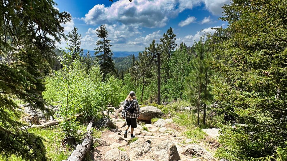 Captured this image while on our 7 mile loop hike in Custer State Park, South Dakota. For me it captures the feeling of being on the trail – I like the branches of the tree on the left which gives you the feel of being IN the forest.