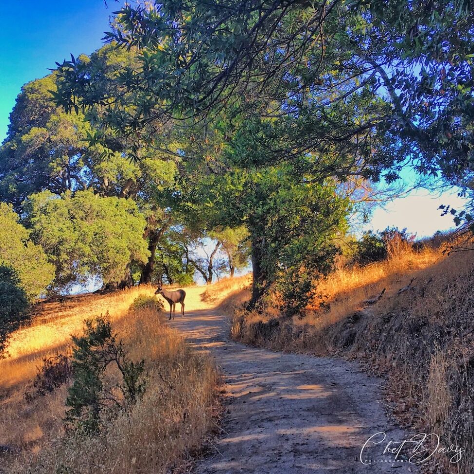 Here’s a photo I captured while mountain biking in China Camp State Park in Northern California. We noticed a deer on the bike path ahead of us so we stopped to enjoy the moment. I love the range of fall colors, consistent with the California late summer-fall landscape. The sunlight peeking over the hillside illuminates the deer as it ponders its next move.