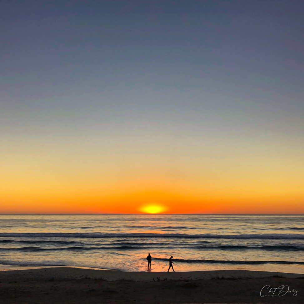 I captured this colorful moment on Torrey Pines State Beach, California. I love the range of colors from deep blue down through the warm colors of the sun and back to a dark black of the sandy beach. The sun barely visible on the horizon with the two people frolicking on the beach and the waves dancing playfully around them.