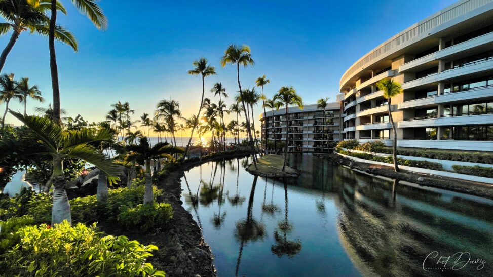 Captured this photo at the Hilton Waikoloa Village on the big Island of Hawaii. I love the range of colors – from the deep blue sky to the pale gold on the horizon. I also love the shapes of the hotel buildings, the different heights of the palm trees and their reflections in the pond.