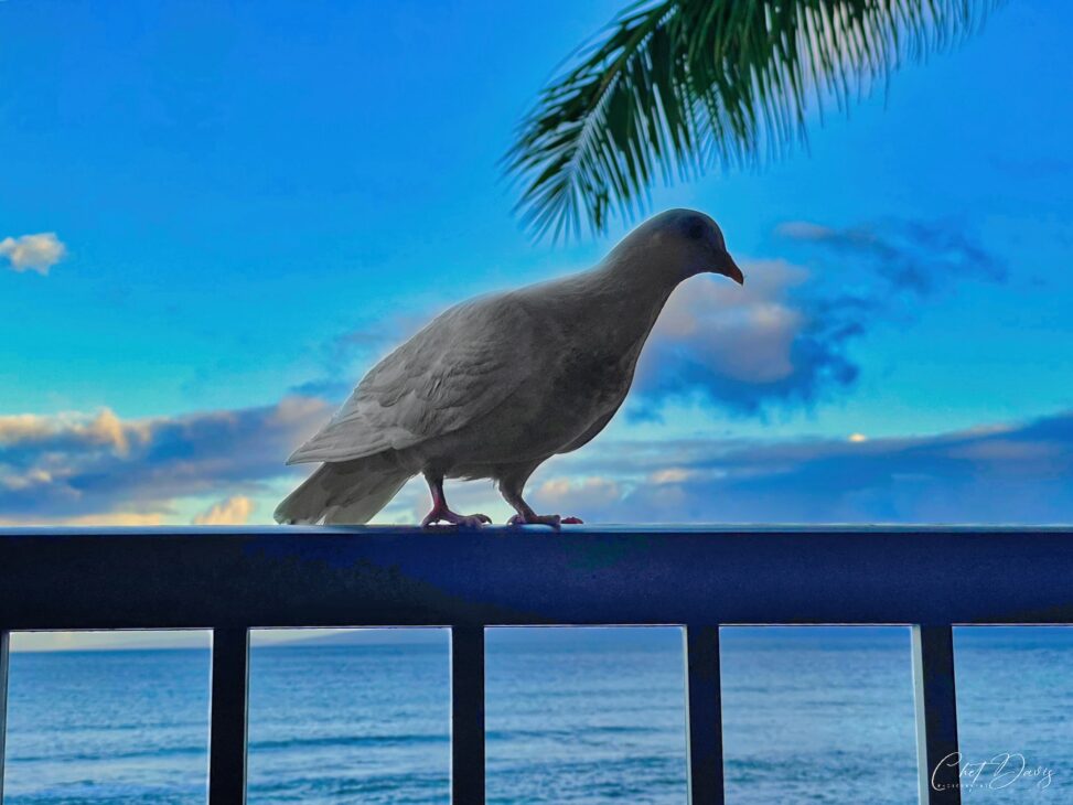 A few years ago on our trip to Maui we had this Pigeon who visited us on our 2nd floor lanai. We were having breakfast and it wanted to see what was on the menu that day. I captured this photo while it was sitting on the railing perusing the choices of the day.