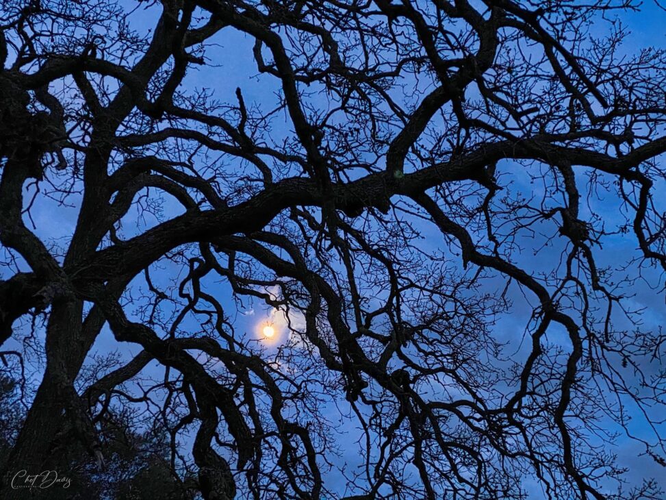 I feel this image gives a strong winter feel – well, here in California we don’t get snow or deep winter cold (not at least where I live). The bare branches of the tree silhouetted against the moon lit cloud sky provides a strong vibe of a cold winter night.